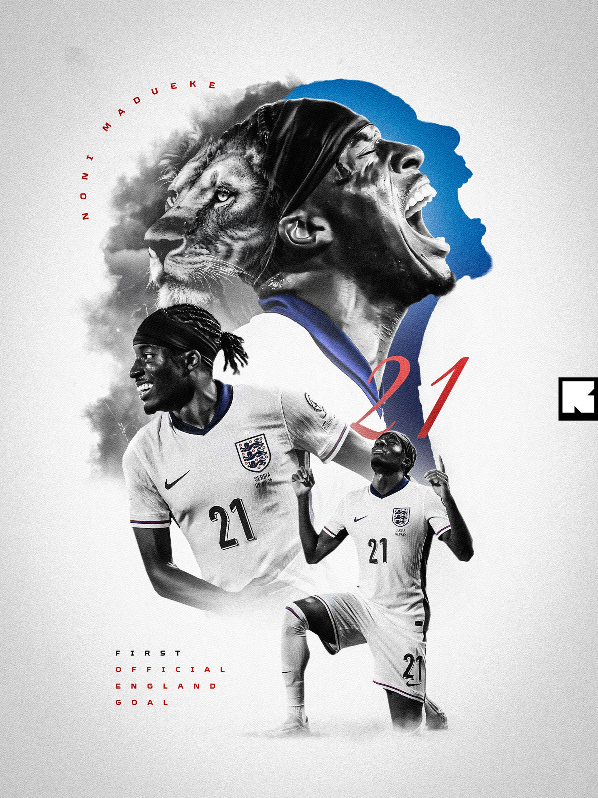 This design is a personal tribute to Noni Madueke, celebrating his very first international goal for The Three Lions. As a football and design enthusiast, I created this visual to capture the energy and emotion of such a special moment on the pitch.